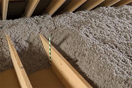 The attic can be insulated using rolled-in fiberglass, blown-in fiberglass or blown-in cellulose. Your choice, but we strongly feel the cellulose is the best insulation material to choose from. Cellulose is more effective, more efficient, longer-lasting and safer than fiberglass. For more information on materials, see our sections on Cellulose vs. Fiberglass, or our section on Blown vs. Rolls.